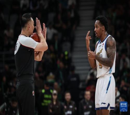 12月15日,浙江方兴渡队球员布朗(右)在比赛中与主裁判闫军交流。新华社记者 潘昱龙 摄